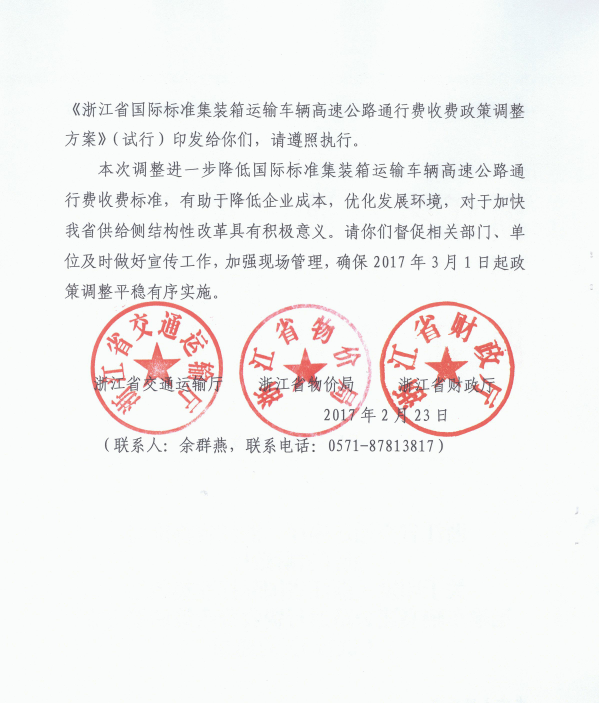 浙江省國際標(biāo)準(zhǔn)集裝箱運(yùn)輸車輛高速公路通行費(fèi)收費(fèi)政策調(diào)整方案(試行) 浙交[2017]23號