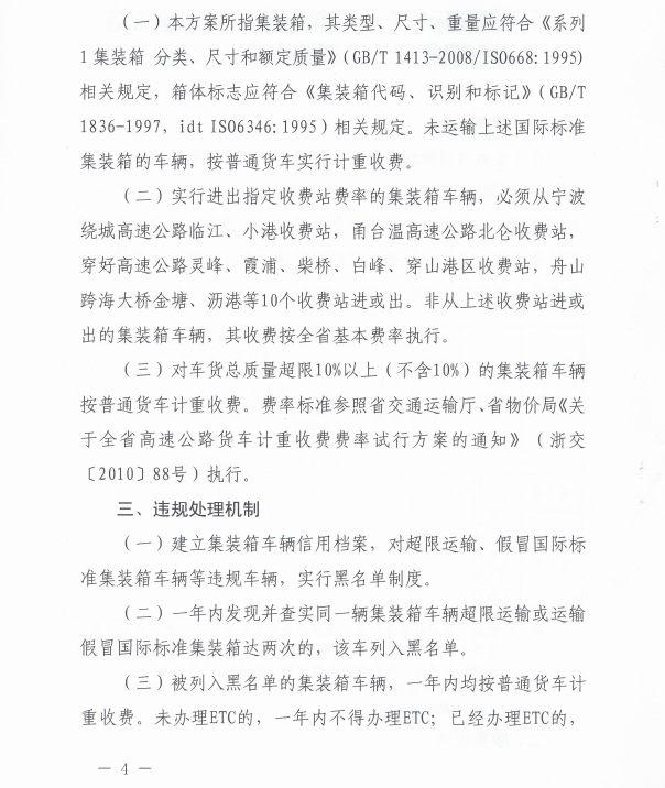 浙江省國際標(biāo)準(zhǔn)集裝箱運(yùn)輸車輛高速公路通行費(fèi)收費(fèi)政策調(diào)整方案(試行)