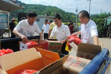 圖為臺州收費所黨支部人員正在搬下慰問品 在與村“兩委”領導親切座談時,慰問組一行對潘山頭村村容村貌有了新變化、村集體經濟有了新發(fā)展表示由衷高興。村“兩委”領導對臺州高速公路集團公司多年來的支持、幫助深表感謝,并表示將繼續(xù)團結帶領廣大村民,共同把潘山頭村建設得更加和諧美好。