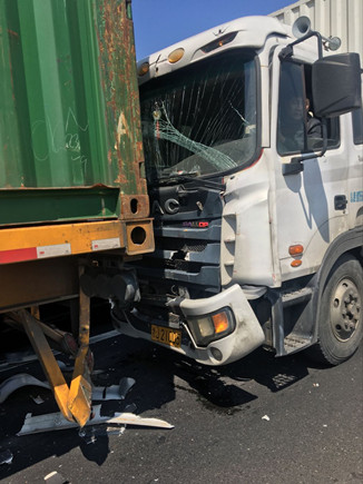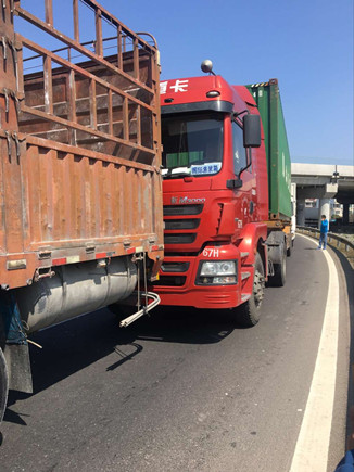 上圖為事故車輛 當(dāng)天中午,在副站崗?fù)づ哉镜墓ぷ魅藛T發(fā)現(xiàn)該所前方出口不遠(yuǎn)處有貨車停在那里不動(dòng),以致后面車輛無法通行。工作人員隨即跑到前方查看情況,原來是三輛貨車發(fā)生追尾,其中有一輛車車頭被撞得凹陷,擋風(fēng)玻璃也被撞碎,在了解事故現(xiàn)場無人員受傷后,工作人員馬上向監(jiān)控中心匯報(bào)情況。由于事故車輛較大面積滯留,導(dǎo)致后方車子堵到主線上,一些不明情況的駕駛員在車?yán)锸箘虐蠢却叽伲F(xiàn)場充滿焦躁情緒。 如何盡快疏通道路?正在食堂吃飯的一班班長潘慶耀放下碗筷跑到事故現(xiàn)場,同工作人員叫前面受損較少的事故車輛先把車子開出收費(fèi)站,再讓第三輛受損嚴(yán)重的車子試著發(fā)動(dòng)車子開出去,所幸三輛車子都能開離車道。在將地上的破損碎片清理到車道兩旁后,工作人員繼續(xù)指揮車輛向前行駛,收費(fèi)內(nèi)廣場在較短時(shí)間內(nèi)恢復(fù)了正常通行。 沈芬芳