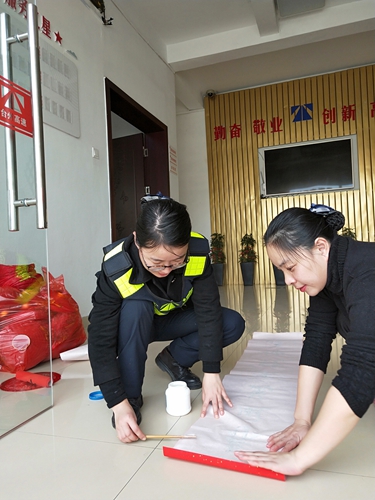 圖為工作人員為營造春節(jié)氣氛分工合作 此外,大家在收費所宿舍區(qū)、辦公樓、收費區(qū)域等地方貼“福”字、貼對聯(lián)、掛燈籠、插彩旗,以大紅或金黃色為主色調(diào),充分烘托出收費所“祥和、喜慶、歡快”的節(jié)日氛圍。