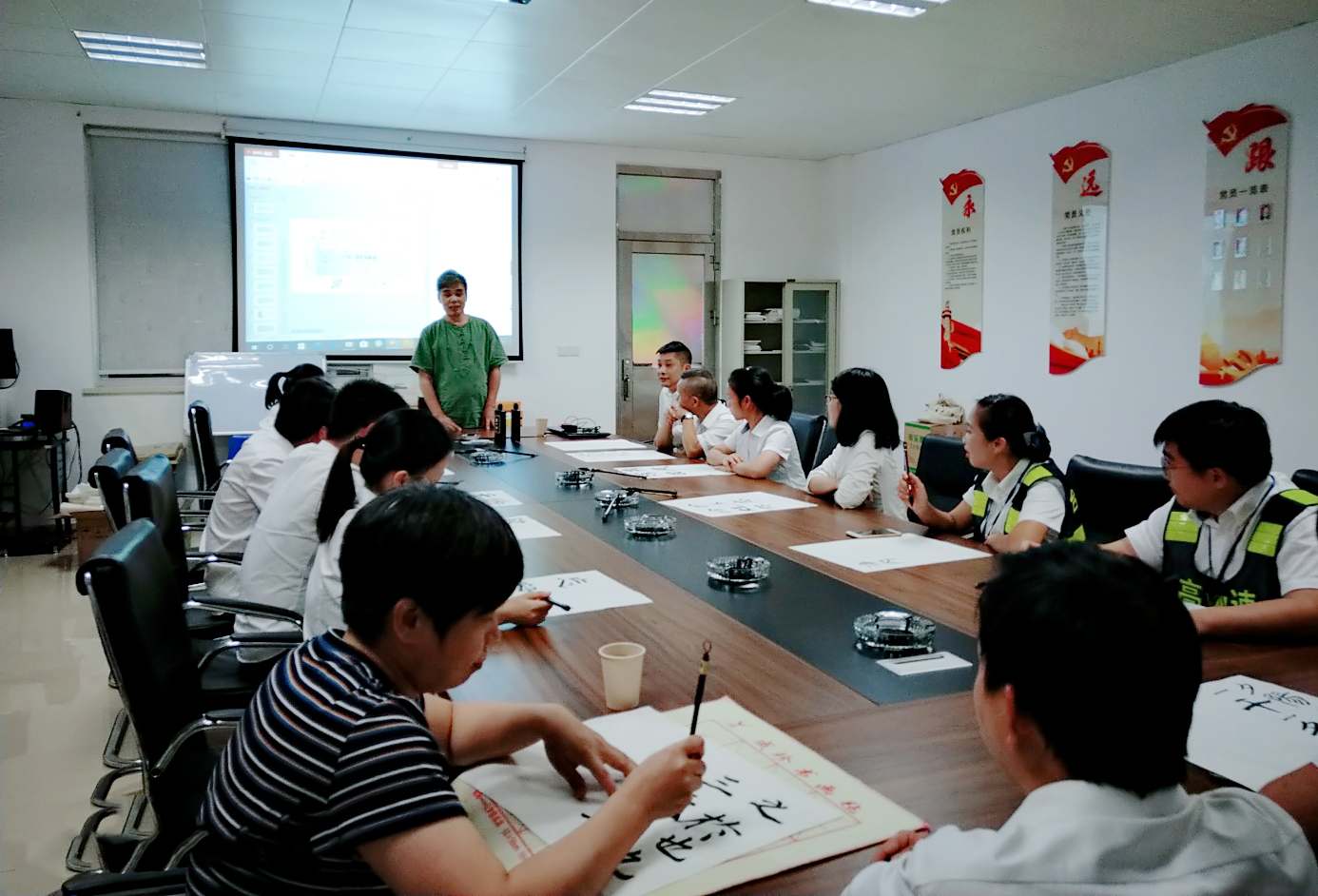 圖為培訓(xùn)現(xiàn)場(chǎng) 本次培訓(xùn)內(nèi)容主要針對(duì)書法作品注意要點(diǎn)展開。課堂上,陳士春以風(fēng)趣灑脫、通俗易懂的授課方式,對(duì)書法作品注意要點(diǎn)進(jìn)行深入講解,并在白板上、紙上進(jìn)行書寫演示,詳細(xì)地講解漢字的起筆與收筆,筆畫之間的搭配,同時(shí)手把手指導(dǎo)學(xué)員們書寫的技巧和注意事項(xiàng),與大家互動(dòng)交流,為大家在學(xué)習(xí)書法過程中遇到的困難答疑解惑。陳士春鼓勵(lì)大家堅(jiān)持每天練習(xí),書法一定要持之以恒,