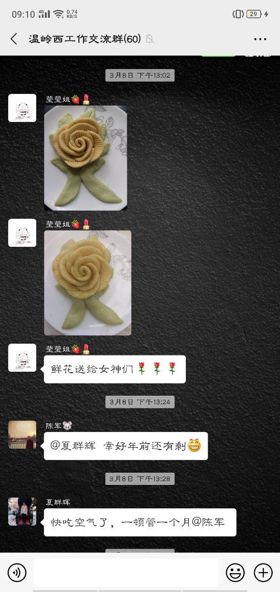 活動中,大家的參與性都很高,紛紛在微信群內(nèi)曬出自己制作的美食:鹽焗雞可樂雞翅、蔥油角角魚、溫嶺小吃豬肉飯、玫瑰南瓜饅頭……紛紛亮出了自己的拿手好菜在群里談論得熱火朝天的同時,也不忘介紹一下自己做的菜甚至很多男同事也紛紛曬出自己的最佳廚藝,祝福女同胞節(jié)日快樂。