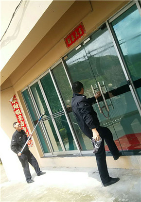 圖為當(dāng)值班組隊(duì)員擦拭站所玻璃門