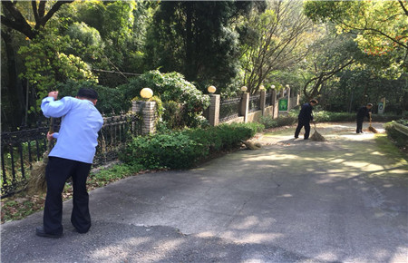 圖為執(zhí)勤隊(duì)員打掃落葉