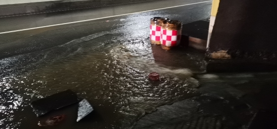 圖為車道水流 當(dāng)晚19:12分,黃土嶺隧道所中控員徐彤霞發(fā)現(xiàn)寧向隧道主車道路面出現(xiàn)積水,如不及時(shí)處置,路面濕滑會(huì)讓過(guò)往車輛打滑,嚴(yán)重影響隧道的安全暢通。為了杜絕安全隱患,管理所立即啟動(dòng)防汛應(yīng)急方案,中控員第一時(shí)間在管理群發(fā)送現(xiàn)場(chǎng)圖片,并在同一時(shí)間通知執(zhí)勤隊(duì)與監(jiān)控中心。 執(zhí)勤隊(duì)員不顧狂風(fēng)暴雨趕赴現(xiàn)場(chǎng),19:19分,斜井現(xiàn)場(chǎng)山上倒灌入隧道的水嘩嘩直流,儲(chǔ)水池水流急促,執(zhí)勤隊(duì)員立即分工合作,一組在主車道擺放安全錐采取防護(hù)措施,并利用沙包,堵住排水溝壁,使水盡量不往外滲,及時(shí)避免了積水對(duì)隧道內(nèi)行車造成的安全隱患。一組檢查潛水泵是否正常運(yùn)行,查看積水入侵的原因、排水溝通暢情況。