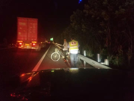 圖為執(zhí)勤隊(duì)發(fā)現(xiàn)騎車人 9月24日21:09分,大溪嶺隧道所中控室發(fā)出通知。執(zhí)勤隊(duì)員接中控指令,迅速出警。晚上九點(diǎn),在高速公路上找人,需得打上12分的精神,巡邏車放慢車速,坐于后座的隊(duì)員們緊盯著車道兩旁,終于在21:14分,距離寧向隧道出口一公里處發(fā)現(xiàn)該騎車男子,隊(duì)員們立即上前將其攔住。眼前的一幕令執(zhí)勤隊(duì)員嚇出一身冷汗,該男子左手殘疾,單手騎車,晚上視線模糊,且高速公路上車多,速度快,司機(jī)很難發(fā)現(xiàn)有行人,如發(fā)現(xiàn)躥出來的行人而采取緊急制動,會造成多起追尾事故,現(xiàn)場情況非常危險(xiǎn)!隊(duì)員們合力將自行車抬上車。