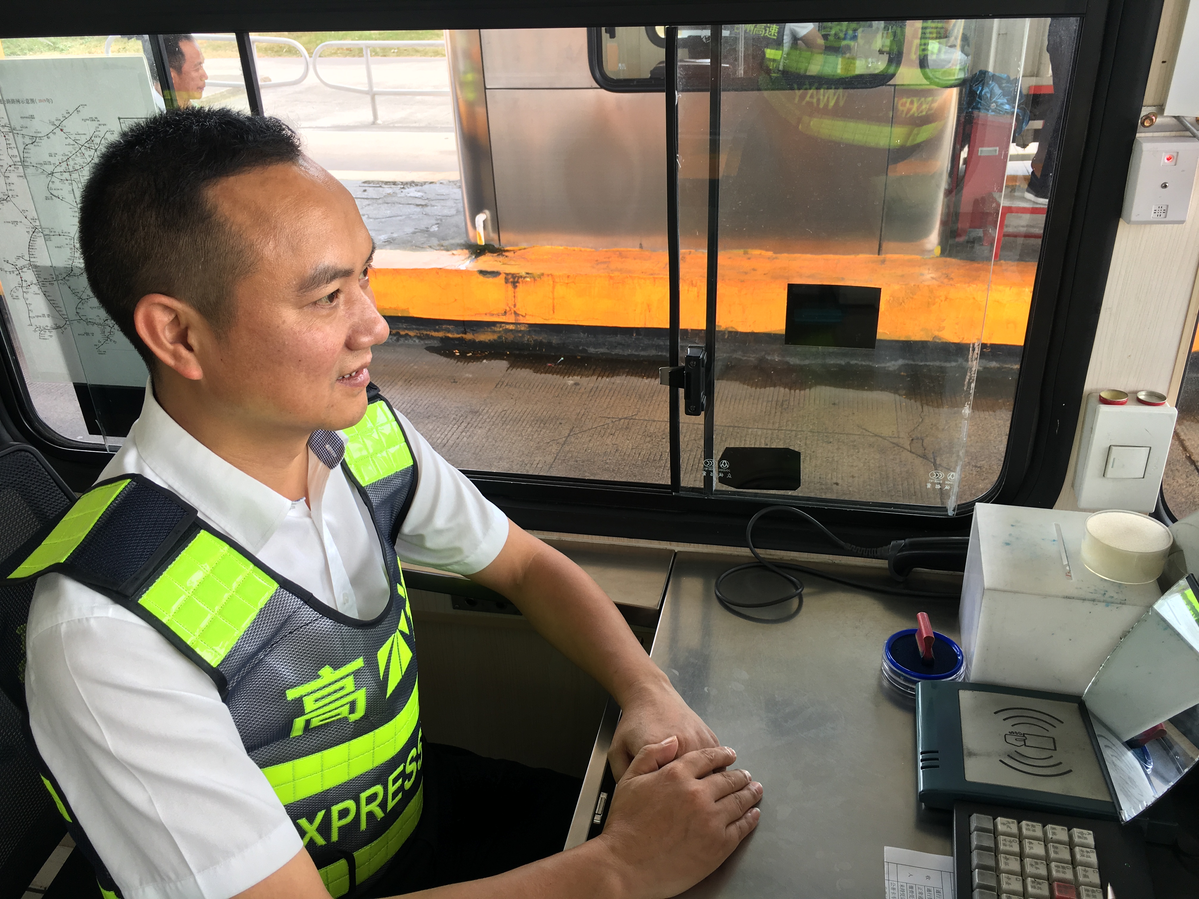 而在對面發(fā)卡的安全總監(jiān)項同富正襟危坐,等待著車子的駛?cè)耄?/span>“記住動作就忘記微笑,笑起來又忘記要說什么......真有點手忙腳亂的,做好收費員,不容易?!?/span>