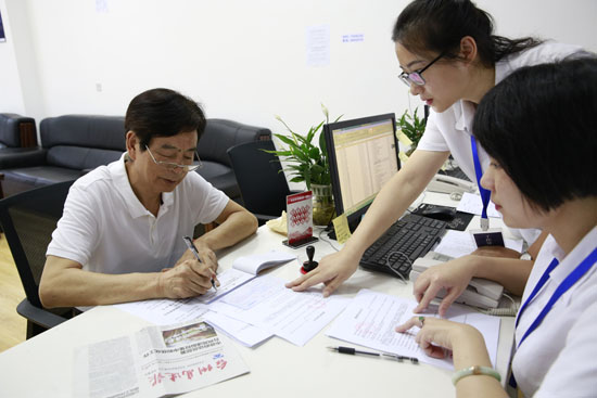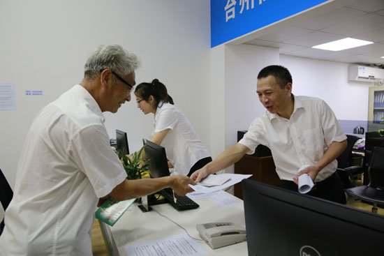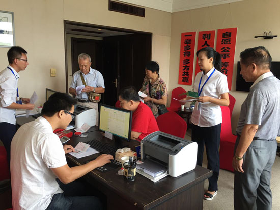 據(jù)椒江收購點工作人員朱海燕介紹,集團(tuán)高齡股東較多,如果他們前來辦理,工作人員會及時上前攙扶股東到審核區(qū)坐下,核對股東是否確權(quán),審核身份證、銀行卡等資料,如果一切無誤便直接帶領(lǐng)股東到辦理區(qū)。