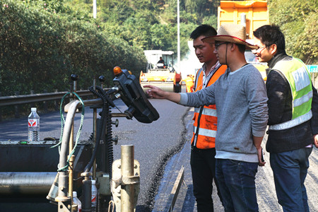 “路面銑刨有時會出現(xiàn)銑刨不完全存在夾層的現(xiàn)象,如不清理干凈則會嚴重影響攤鋪后路面的平整度?!睏罱鹆航榻B道,所以攤鋪時每道工序,他都時刻緊盯,確保攤鋪的路面不存在任何瑕疵。
