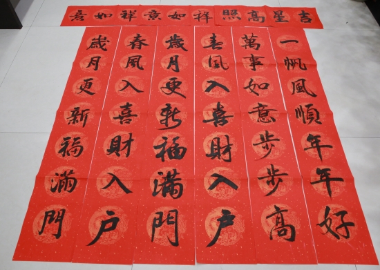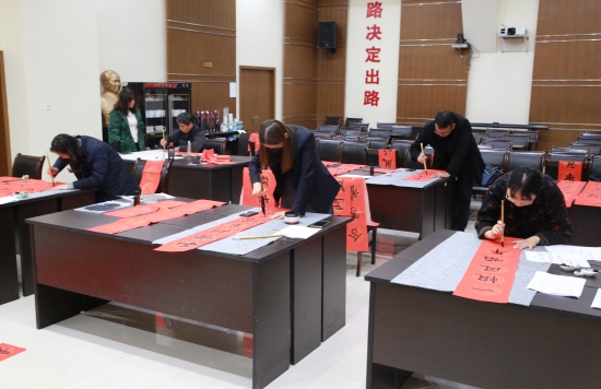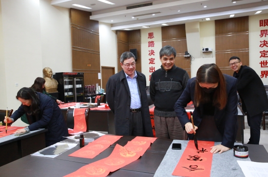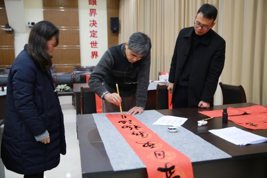 臺(tái)州高速集團(tuán)開展“寫春聯(lián)、送祝福”活動(dòng) 春節(jié)將至,臺(tái)州高速集團(tuán)開展以“迎新春、送祝?!睘橹黝}的寫春聯(lián)、送春聯(lián)活動(dòng),并邀請(qǐng)書法老師到場(chǎng)指導(dǎo)。來自集團(tuán)各部室、所、子公司的書法愛好者紛紛前來參與,集團(tuán)董事長、總經(jīng)理陳文波到場(chǎng)觀摩。