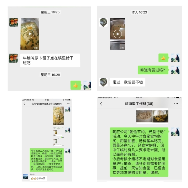 臨海南收費(fèi)所不只是單單把宣傳標(biāo)語(yǔ)掛在墻上,擺在桌上。更把節(jié)約舉措落實(shí)到具體行動(dòng)中。為了不浪費(fèi)食材,行政人員提前安排一周菜單,并統(tǒng)計(jì)用餐人數(shù),規(guī)劃食材數(shù)量,食堂工作人員按照人數(shù)采購(gòu)當(dāng)天食材控制成本,并將每餐燒好菜拍成視頻上傳食堂交流群,更好關(guān)注食堂動(dòng)態(tài),從源頭把控菜量與伙食的品質(zhì),每周還不定期抽查食堂,查看剩余量。