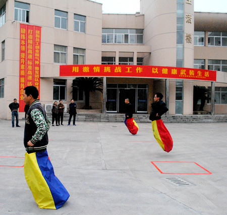 圖為“跳袋鼠”比賽 上午9點整,隨著臺州收費所所長、分工會會長王小勇的一聲令下,趣味競技活動正式拉開帷幕。此是自分工會成立以來第一次組織的妙趣橫生的集體活動,參加人員個個摩拳擦掌、躍躍欲試,有的迫不及待地在一旁先練開了。 此次趣味活動本著“重在參與、愉悅身心、全民健身”的原則,以豐富員工健康向上的業(yè)余文化生活為目的,分集體和個人兩種比賽方式。集體項目有“二龍戲珠”、“齊心協(xié)力”、“我是喬丹”、“集體跳繩”共4項;個人項目有“絕對公平”、“夾豆比賽”、“單人跳繩”、“跳袋鼠”、“車輪滾動”共5項。在集體項目中,各隊配合默契,勇往直前;單人賽中,各位員工積極參與,有幾個為爭第一不小心摔倒,手掌擦破了皮,褲子摔破了也絕不放棄,爬起來繼續(xù)參加比賽,堅持到最后。